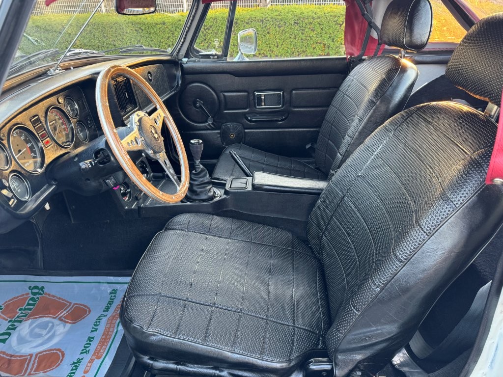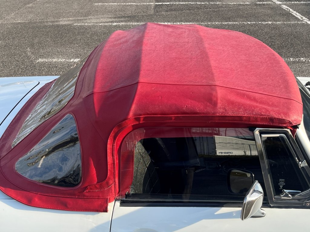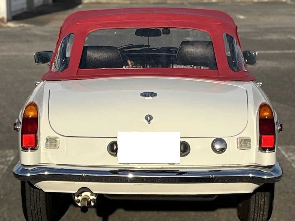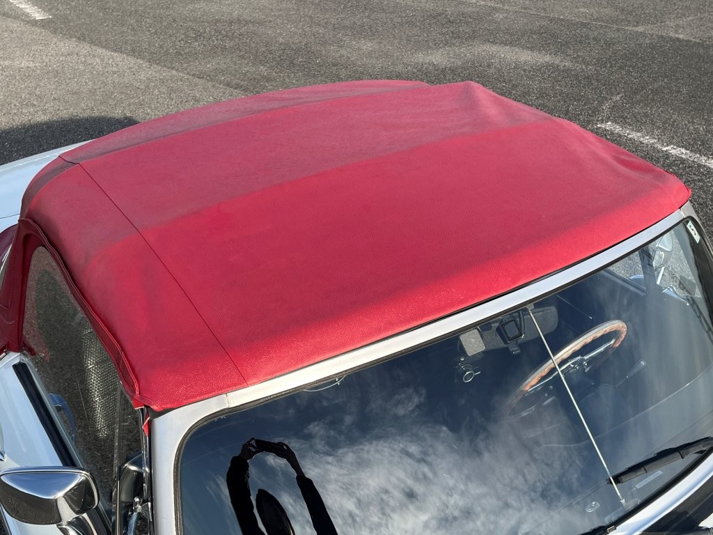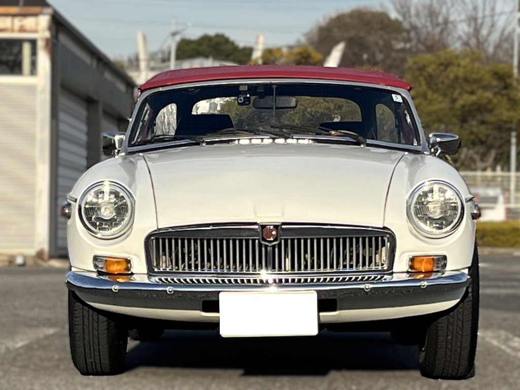 流麗で無駄のないクラシックなボディラインに、ホワイトの外装と赤いソフトトップのコントラストが映える一台です。クロームバンパーと丸目ヘッドライトが醸し出す佇まいは、まさに“走る英国紳士”。街並みにも自然に溶け込み、停車中でさえ絵になります。